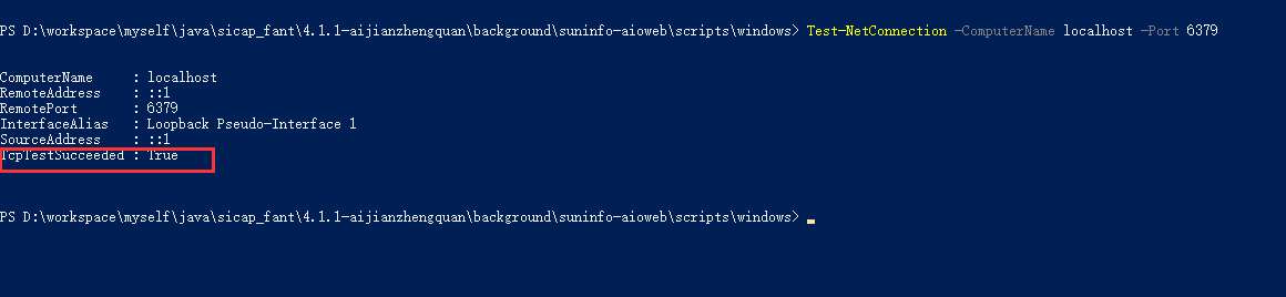输出:TcpTestSucceeded: True 表示端口已打开。