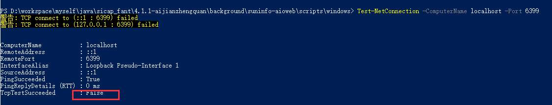 TcpTestSucceeded: False 表示端口关闭或无法访问。