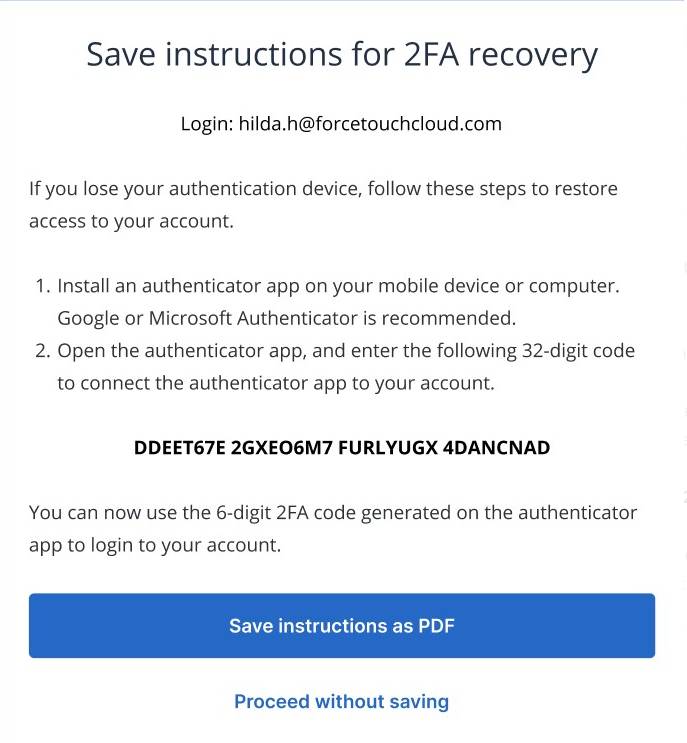 确保您已保存包含32位代码的PDF文件用于双因子认证(2FA)恢复是至关重要的,因为这是最便捷的重新获取访问权限的方式。