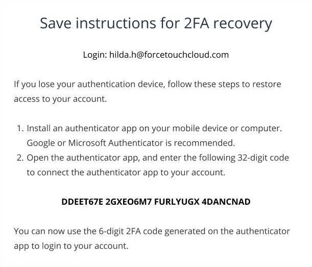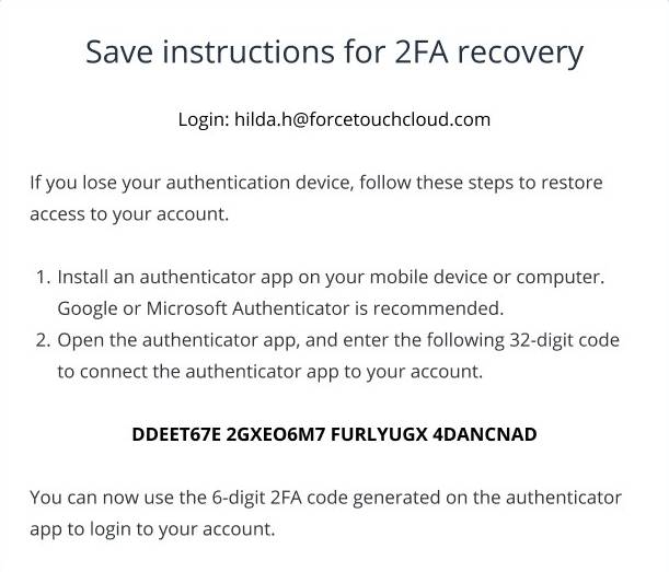 - 在初始设置双因子认证时,请保存用于双因子认证恢复的32位代码。您可以将其打印出来、保存位PDF文件或直接拍照留存。